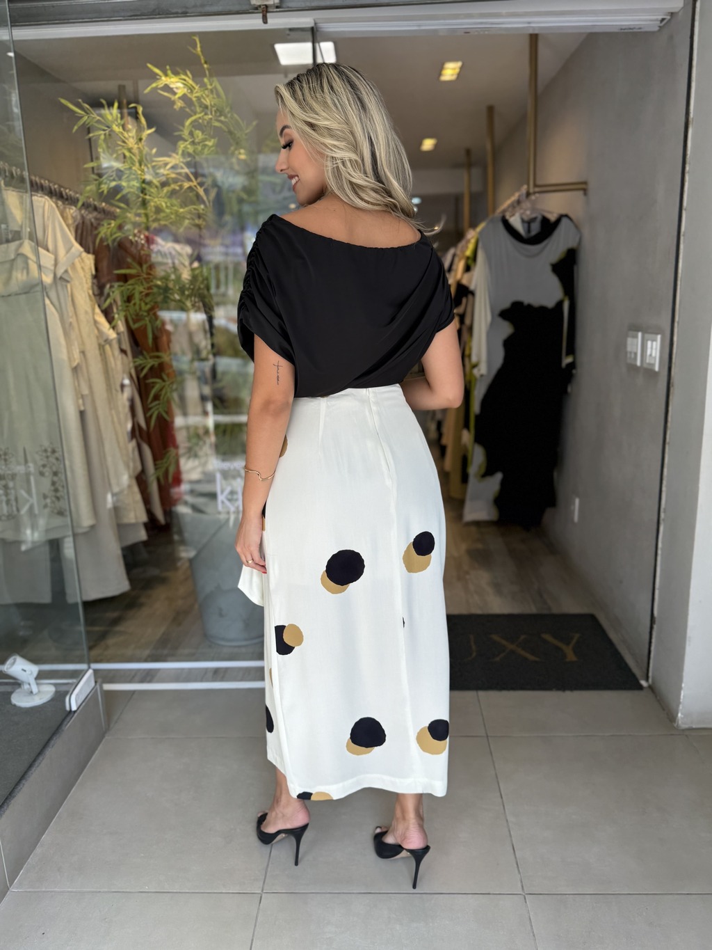 Elegância e originalidade se encontram nesse conjunto que une duas propostas em perfeita harmonia: a blusa de ombro único, moderna e cheia de atitude, e a saia envolvente, com amarração lateral que valoriza a silhueta e acrescenta movimento ao visual. A estampa expressiva quebra a monotonia e garante uma produção cheia de estilo, ideal para ocasiões que pedem presença marcante. Versátil, pode transitar entre um evento sofisticado e um encontro descontraído, sempre transmitindo confiança e sofisticação em cada detalhe.